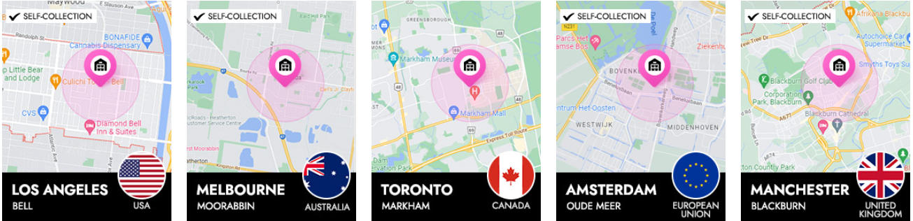 Our US warehouse is located in Los Angeles, AU warehouse is located in Melbourne, Canada warehouse is located in Toronto, EU warehouse is located in Brussels/Madrid, and UK warehouse is located in Blackburn.